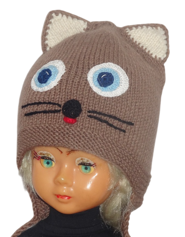 Megzta kepurė su ausytėmis ir raištukais maždaug 5-7 m. vaikui.