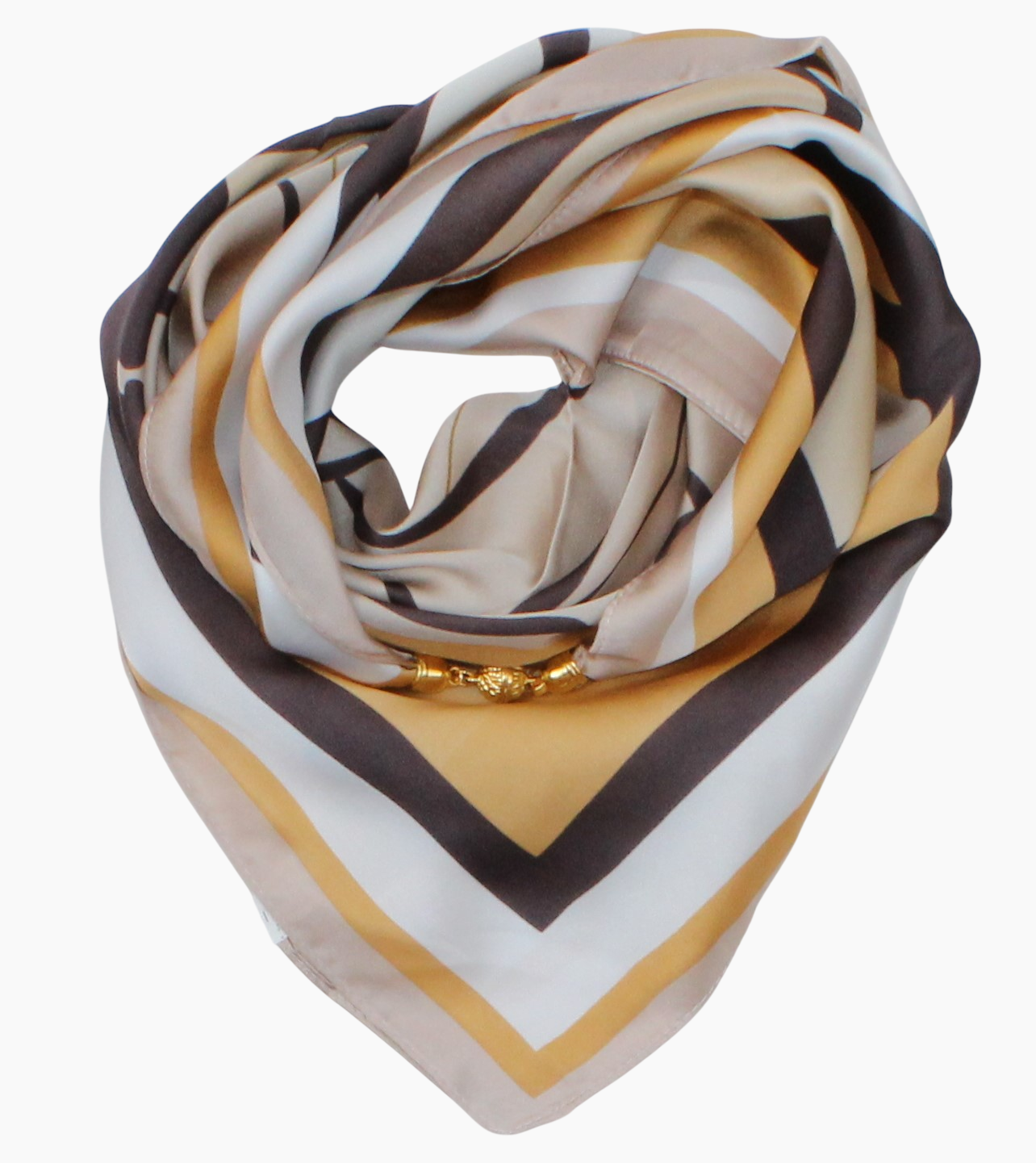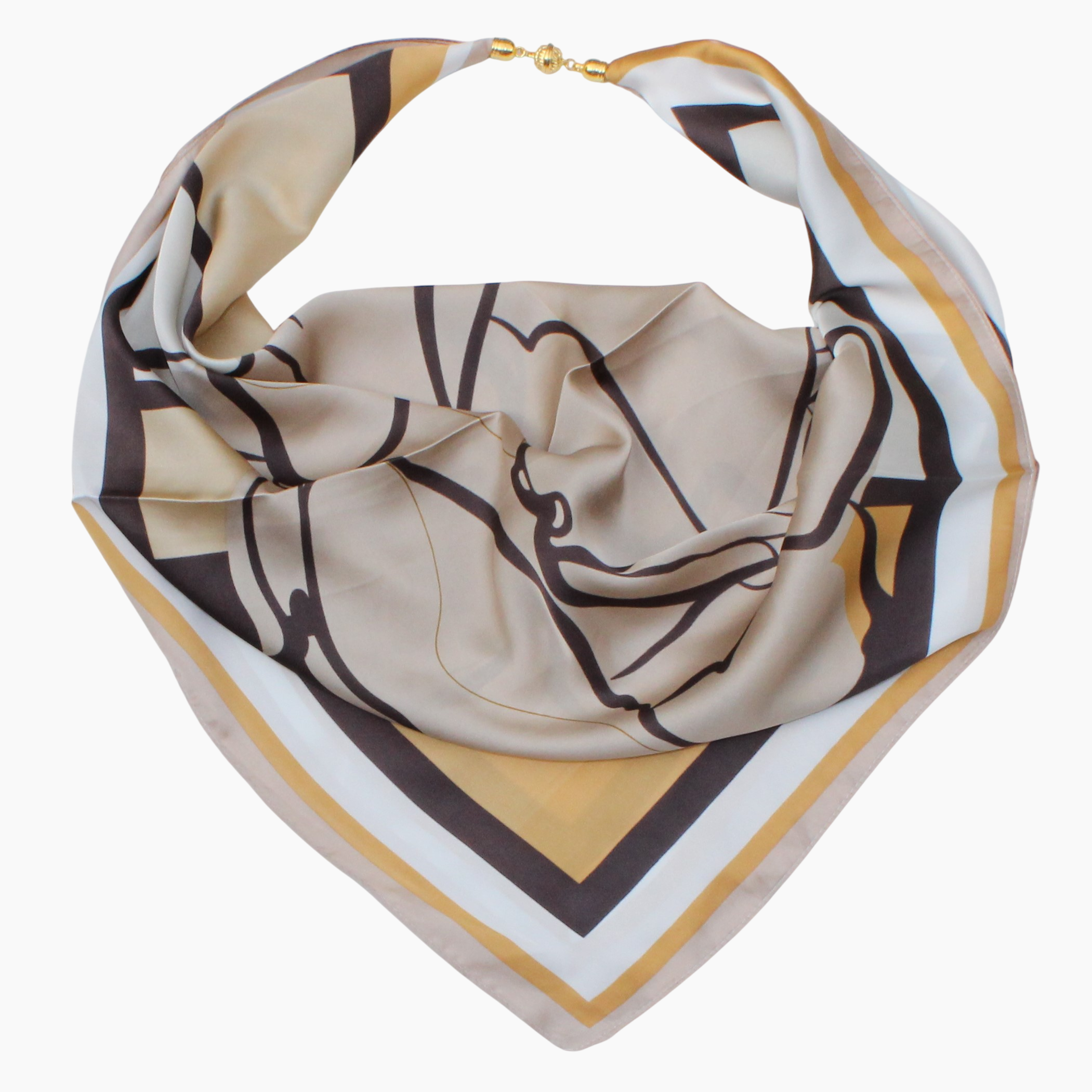 Suteikite savo įvaizdžiui romantiško žavesio su šia 68x68 cm dydžio skaryte. Pagrindinis akcentas – stilinga, grafiška rožė, puošta šiltais auksiniais, smėlio ir klasikinės juodos spalvos tonais. Tai universalus aksesuaras, kuris puikiai papildys tiek dalykinį kostiumėlį, tiek lengvą pavasarinį paltą ar suknelę.