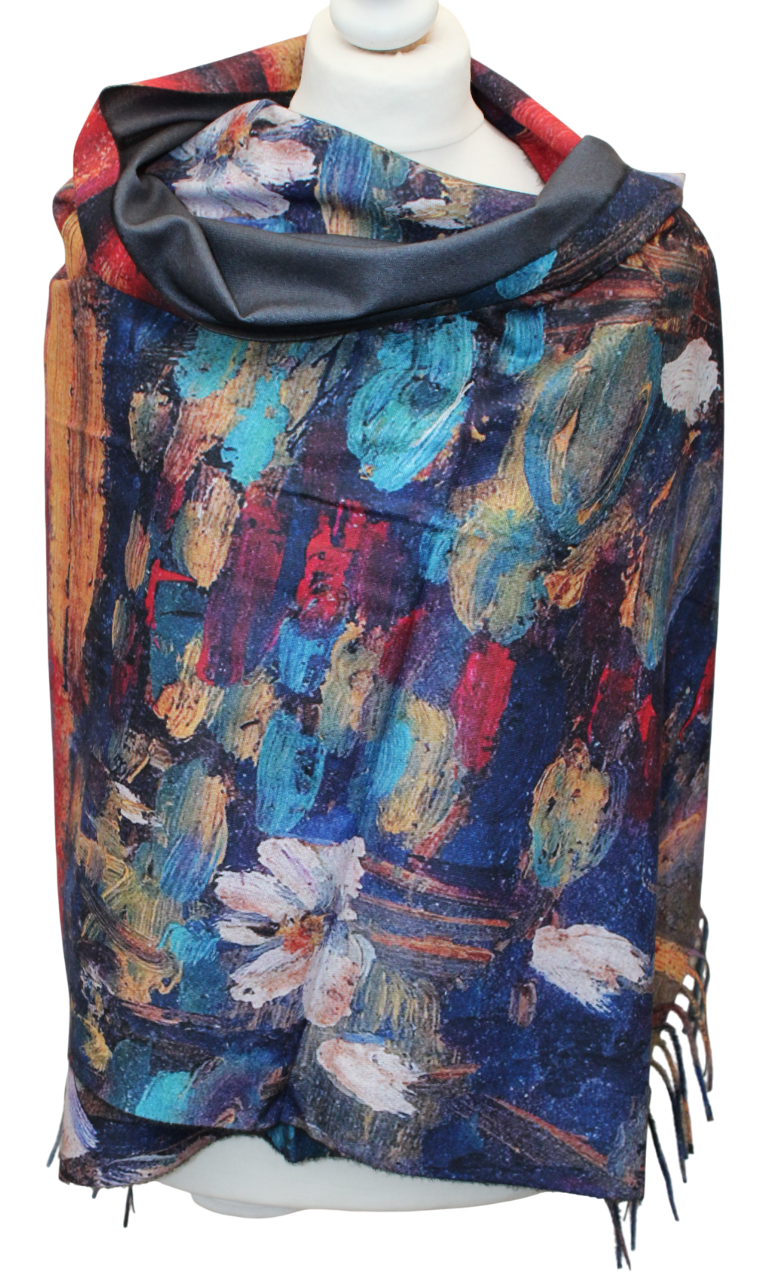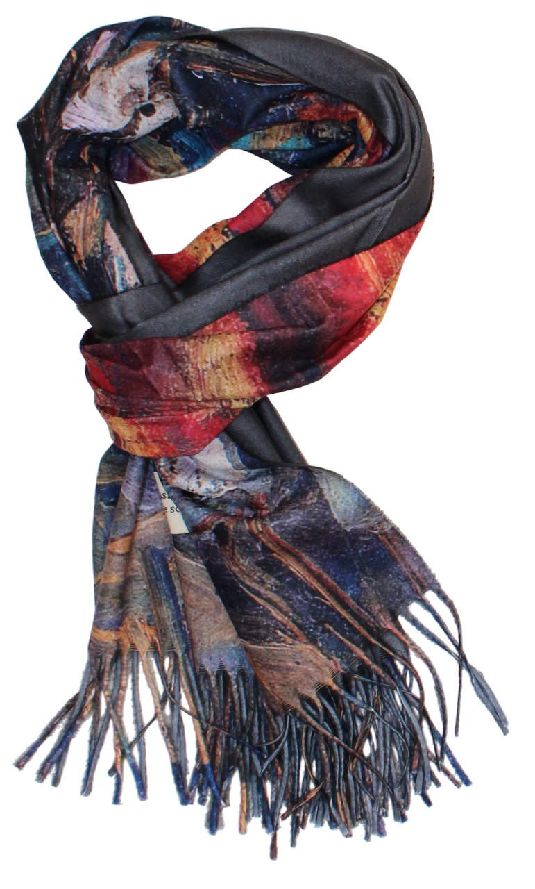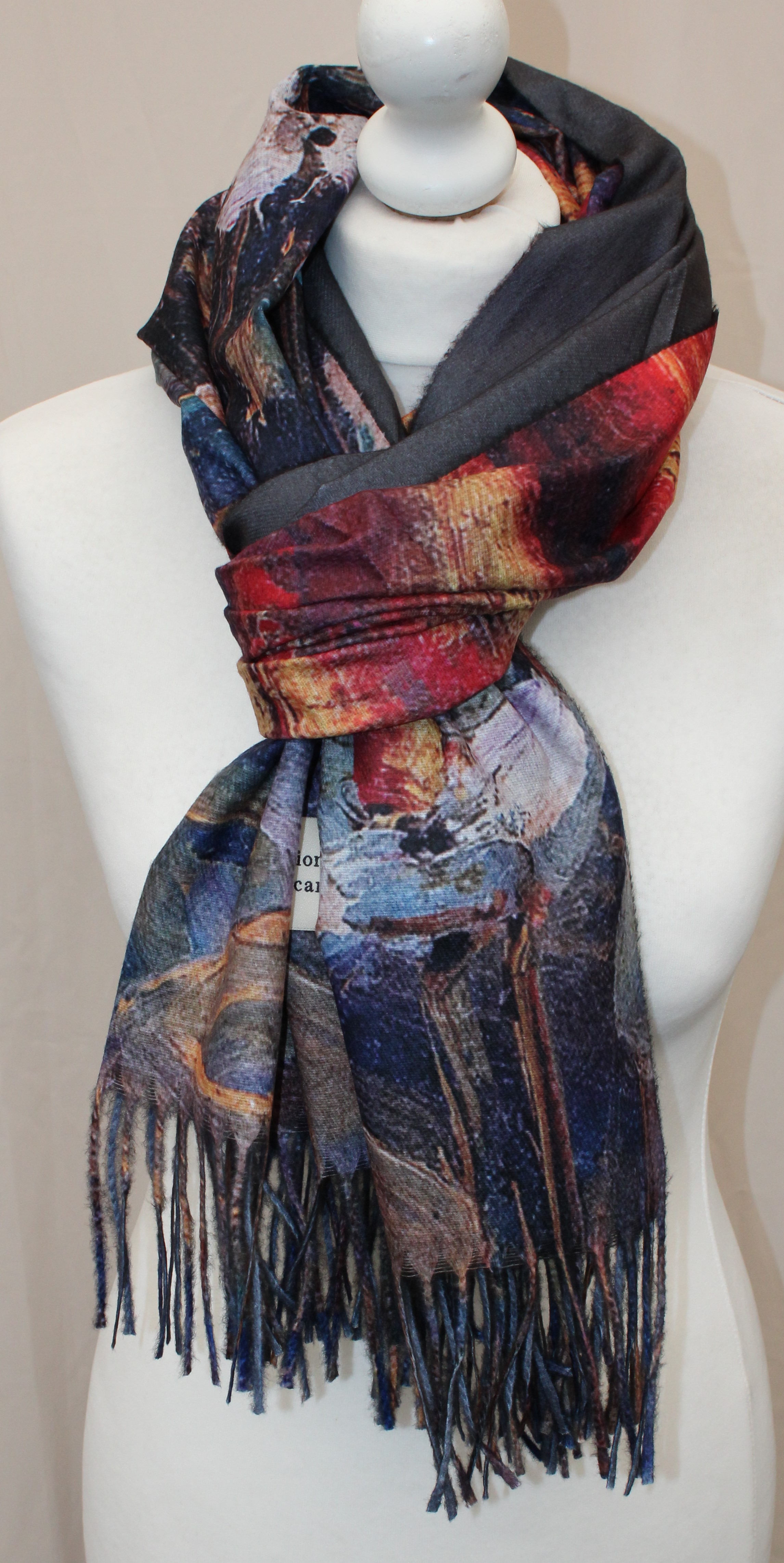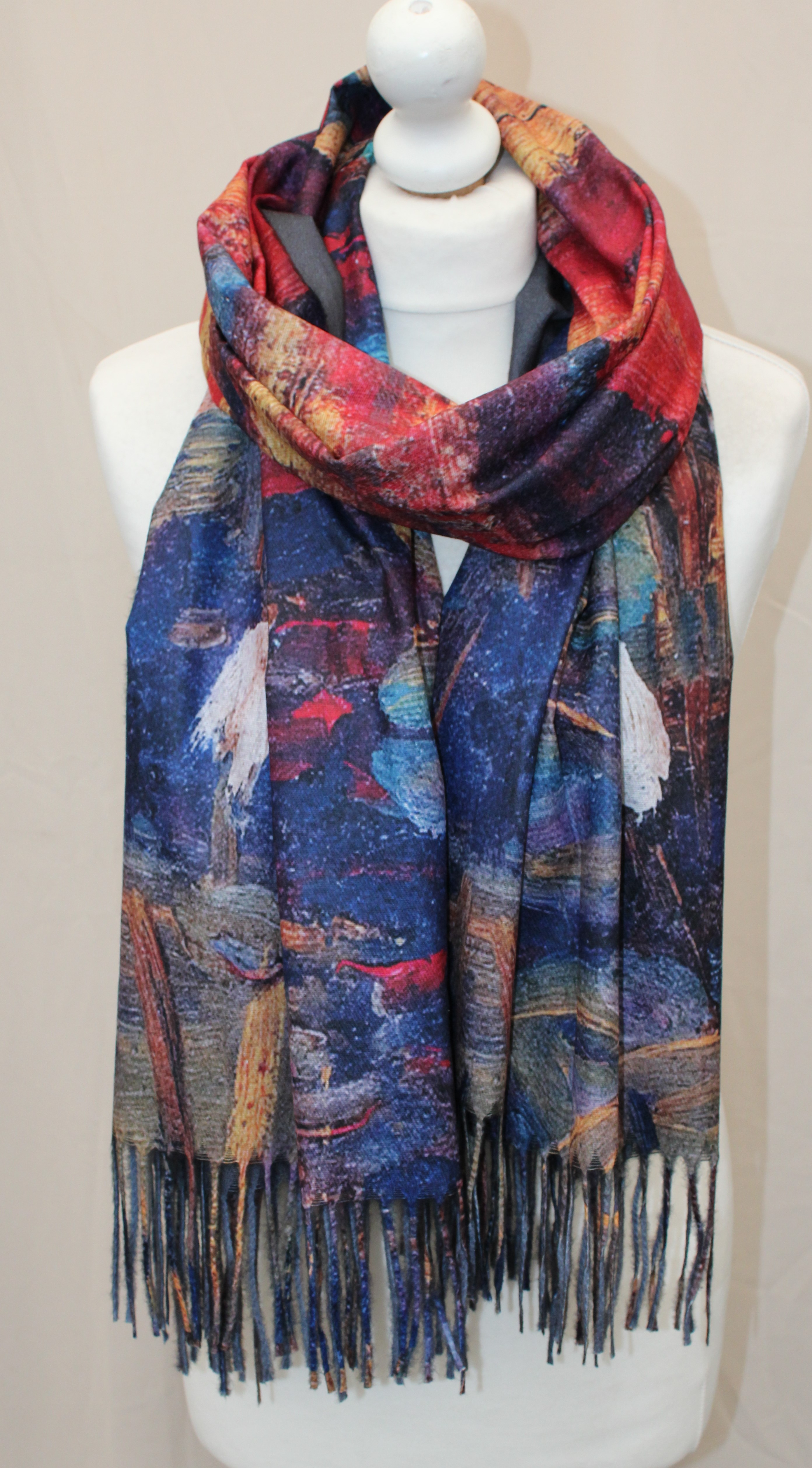 Vidutinio storumo šiltas šalikas su piešiniu.